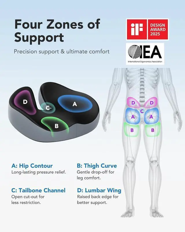 Four-Zone Ergonomic Comfort: Featuring four distinct support zoneship contour, thigh curve, open tailbone channel, and lumbar support wingsthis chair cushion is shaped to fit your body's natural form. The ergonomic design evenly distributes pressure, helping to reduce fatigue, numbness, stiffness, and pain. This seat cushion for office chairs is a must-have for long periods of sitting, whether youre using it on your office chair or in your car. Say goodbye to chronic discomfort with this pressure relief seat cushion.