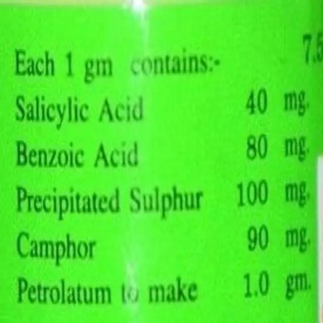 Ingredients : Each 1 gram contains, Salicylic Acid 40 mg, Benzoic Acid 80 mg, Sulphur, Precipitated 100 mg, Camphor 90 mg, Petrolatum to make 1 mg