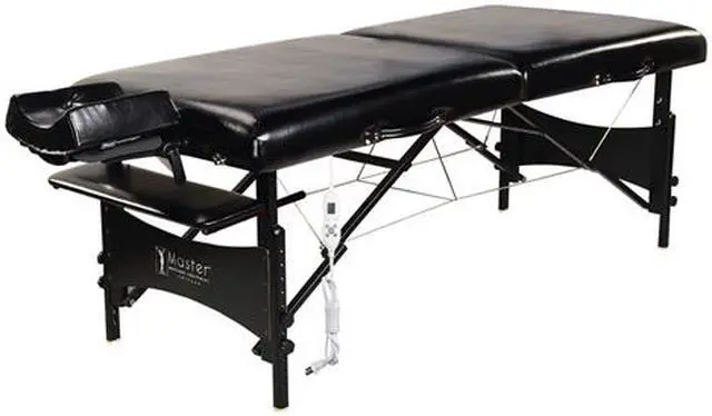 Unparalleled craftsmanship and innovation combine for an out of this world Galaxy ThermaTop Pro portable massage table. It's the definition of being able to bring professionalism on the road, even including Master Massage's exclusive ThermaTop for adjustable heat throughout the table to soothe muscles, improve circulation and relieve tension. The ThermaTop is ETL-certified to USA safety standards and EMR-safe against electromagnetic radiation. Beautiful and strong antimicrobial Nanoskin upholstery complements the glossy black hardwood legs, surrounding clients in luxury while still being durable enough for everyday heavy use. Master Massage specially created the 3" thick Multi-Layer Small Cell foam to be denser than average table foam, and didn't stop there but proceeded to add comfort with an additional layer of memory foam. Clients can have peace of mind that they are in good hands with additional safety measures like Duo-Plane hinges to reinforce the center of the table and Clevis Block leg attachments to guarantee unbreakable legs. This professional package includes a six-way adjustable ErgonomicDream face cradle, memory foam ErgonomicDream face pillow to relieve pressure points, "Florida Style" armrest shelf and four pocket carrying case.