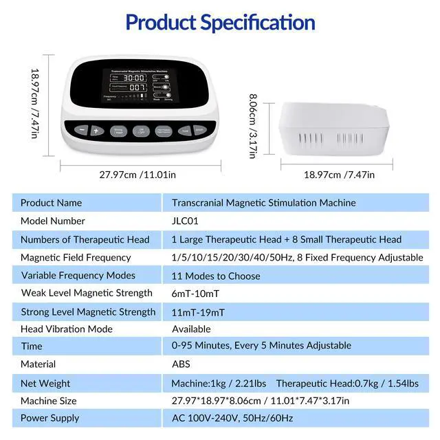 Package Details of TMS Therapy Treatment Safe and Effective. includes 1*Transcranial Magnetic Stimulation Machine+ 1set*Magnetic Therapeutic Head, 1*Charging Power Supply,1*User's Manual, and 1*Packing Box. Also we provides one year warranty. More detail information, please see the product manual. If you have any questions about our transcranial magnetic stimulation treatment, please contact us. We are committed to providing you with satisfactory services.