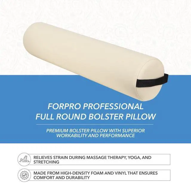 ForPro Full Round Bolster is made from high-density foam and vinyl. It is designed to relieve strain from lower back during massage therapy and add comfort during yoga and stretching.