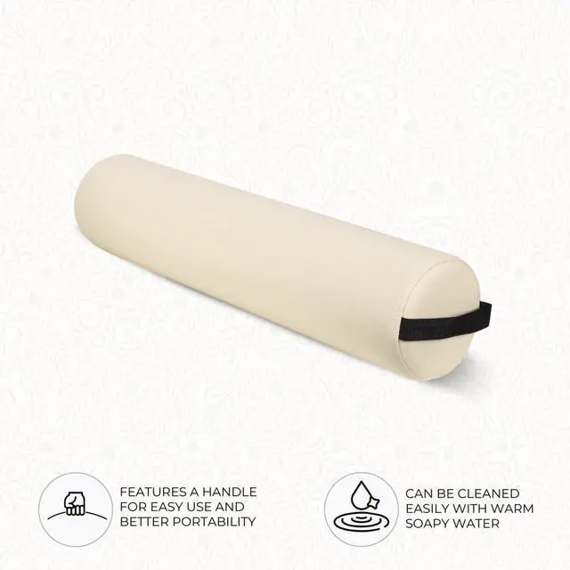 ForPro Full Round Bolster features a handle for ease of use. The bolster can be placed under the knees during face up massages, under the ankles when face down, and can also be used to support the neck.