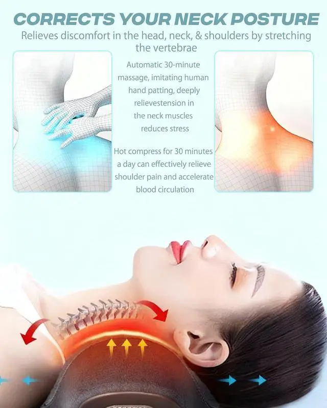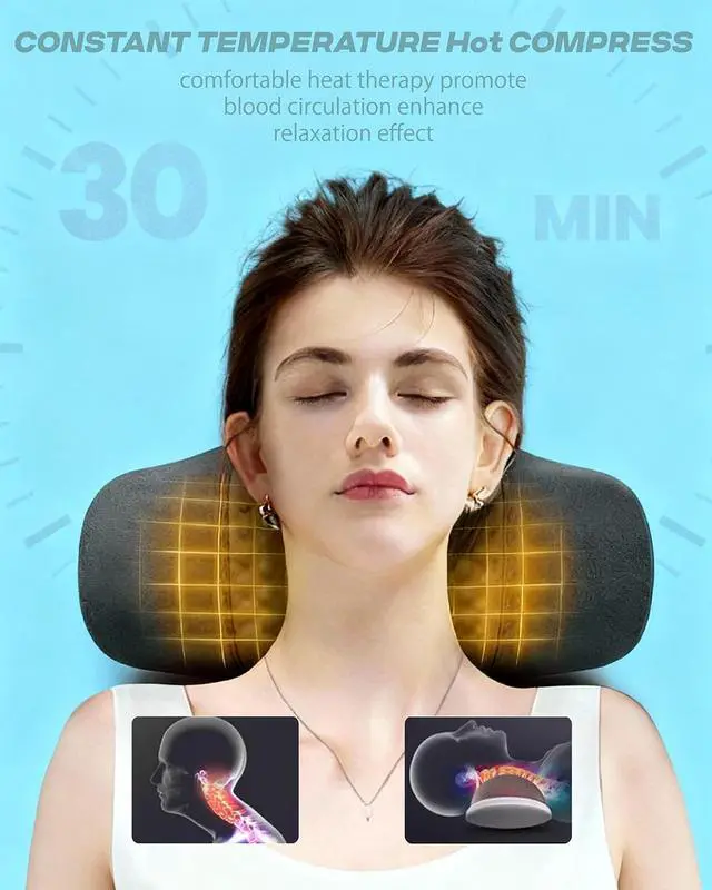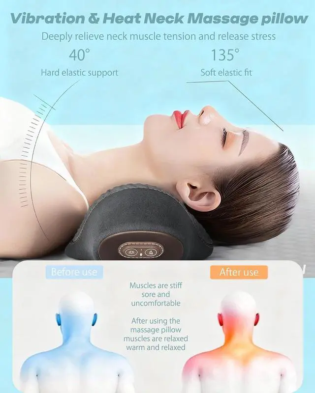 Ultimate comfort and targeted relief for your neck and back with our multi-functional Neck & Back Massager, expertly crafted to follow the natural contours of the human body. Its ergonomic design not only delivers a snug fit to your neck and back for optimal support but also helps promote proper neck alignment over time, addressing common concerns like irregular neck curves. Equipped with 3 adjustable heat levels (86°F/104°F/122°F), this massager lets you customize warmth to soothe tense musclesperfect for easing stiffness after long hours of sitting or standing. Complementing the heating function are 3 vibration intensity levels, all conveniently controlled via a user-friendly Key press , making it suitable for users of all ages and fatigue levels. For added safety, it automatically shuts off after 30 minutes to prevent overuse. Super elastic memory foam designed according to ergonomic curves, it perfectly fits your shoulder and neck curves, providing excellent support. The comfortable cervical angle also helps correct incorrect neck curves and hunchbacks