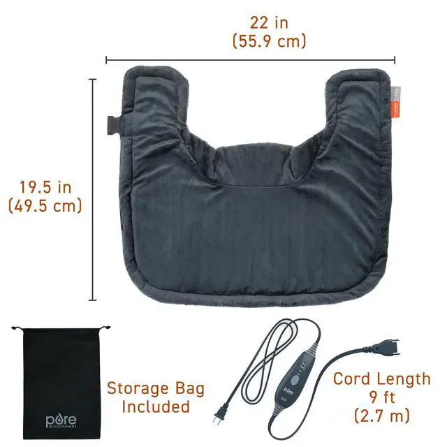 Get deeper relief in your upper back with the PureRelief Pro Far Infrared Neck & Shoulder Heating Pad. Designed with innovative InfraWave Technology, this heating pad features a built-in layer of heat-retaining ceramic beads that send safe, far infrared wavelengths below the skins surface to target sore spots and penetrate muscles more deeply than traditional heating pads. This revolutionary heating pad provides temporary relief for all of your major and minor muscle aches and pains, including inflammation, joint stiffness, arthritis pain, spasms, and more, while also providing exceptional neck and shoulder pain relief. Its the best heating pad for athletes, runners, active individuals, and anyone who suffers from chronic pain. Enjoy 4 heat settings from 4 levels of heat ranging from 110-140 with the easy-to-use handheld controller. The smart auto shut-off feature will power down the heating pad after 2 hours of continuous use to avoid overheating. Start feeling relief today with the far infrared heating pad from Pure Enrichment. One Size Fits Most: Universal fit works for everyone, while the magnetic closure secures the heating pad 4 Fast Heat Settings: Choose the level of warmth that works best for you with settings that range from 110 to 140 Easy to Clean: Hand wash to retain softness or disconnect the cord and put it in your washing machine. Wash in cold water on the gentle cycle, then tumble dry on low heat or line dry Auto Shut-Off: Stops the pad from overheating after 120 minutes of continuous use Included Storage Bag: Makes it easy to wrap up, bring to the gym, store in a closet, or use while traveling for relief any time