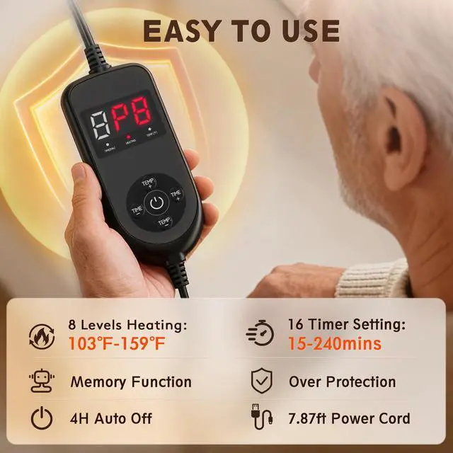 - Customizable Settings to Meet All Needs This neck and shoulder heating pad comes with 8 temperature settings (P1-P8) and 16 timer options (15240 minutes)plenty of modes to match your different needs throughout the day. The 2.4m/7.87ft power cord lets you use it on the couch, in bed, at the office, or in hotels while traveling. Best of all, it works with 110V-220V voltage and overheat protection feature, so its no longer limited to use in the US. You can take it with you and use it when traveling to any country!