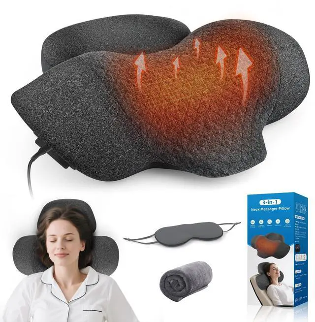 3-in-1 neck massager pillow with heat, vibration and cervical traction for neck pain relief at home.