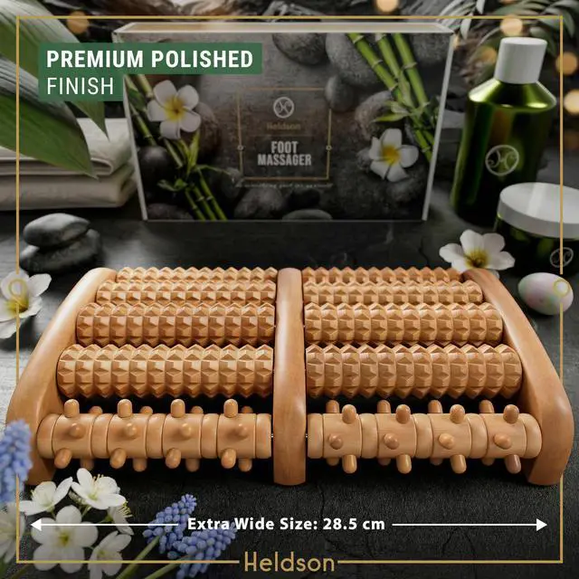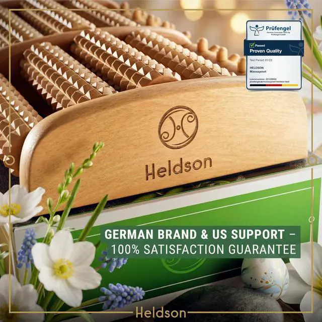 The Heldson foot massager roller is made from FSC 100% certified wood and has been dermatologically tested by Dermatest, receiving the rating “Excellent” for skin compatibility.