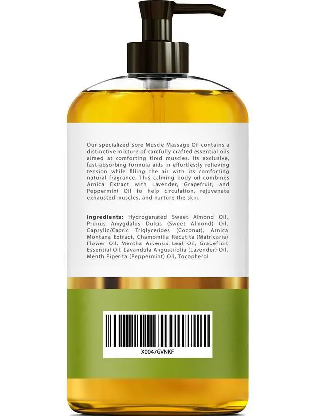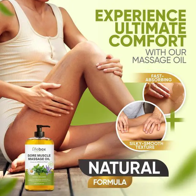 SORE MUSCLE MASSAGE OIL FOR MASSAGE THERAPY Our 100% Natural formula, expertly crafted to help alleviate tired, aching muscles. With its easy absorption and natural aroma, this oil helps eases tension while leaving your skin feeling deeply nourished and moisturized.