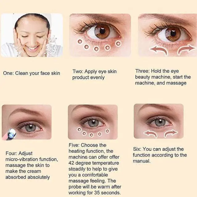 - High-frequency micro-vibration and heating massage to reduce puffiness and dark circles