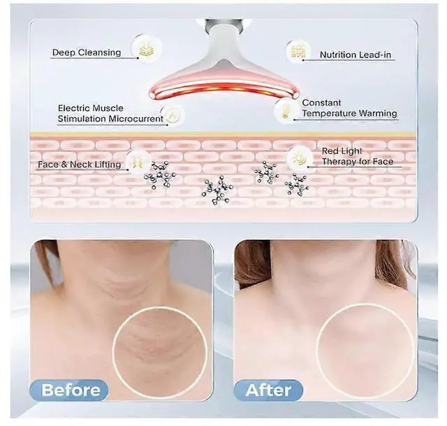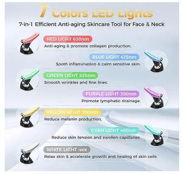 7 LED light modes for face, neck, arms, and shoulders to tighten skin and relax muscles