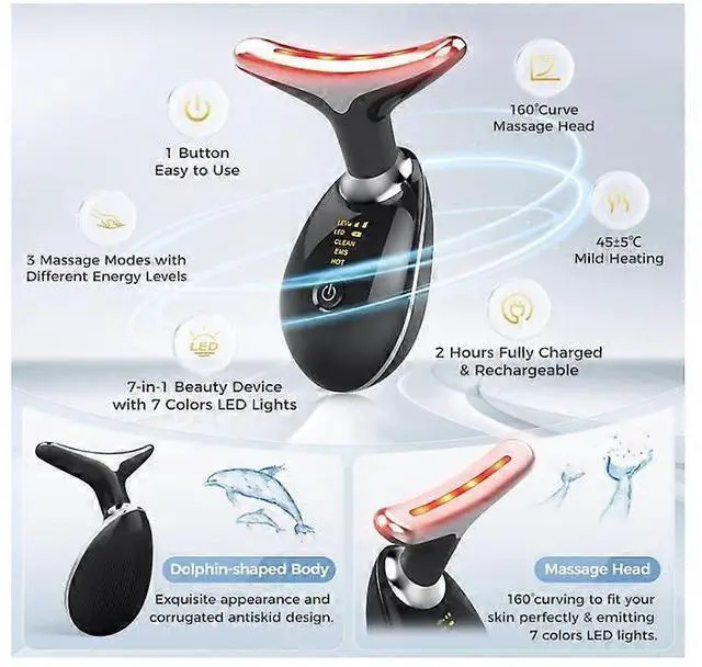 Experience professional skincare at home with the dolphin-shaped 7-in-1 massager. Its ergonomic 160-degree curve fits face and neck contours perfectly, while the non-slip handle ensures comfort.