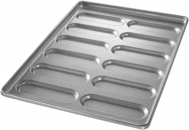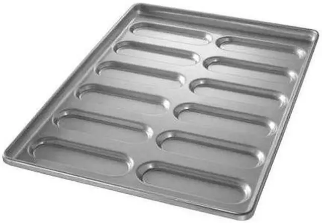 Hoagie Bun Pan, Gauge 22 ga, Material Aluminized Steel, Dishwasher Safe No, Freezer Safe No, Oven Safe Yes, Color Silver, Overall Length 25 3/4 in, Overall Width 17 3/4 in, Overall Depth 1 1/2 in, NSF Certified No, Number of Slots 12, Pan Style Rounded End Hoagie Pan. This item has been restricted from sale in the following state (s): []