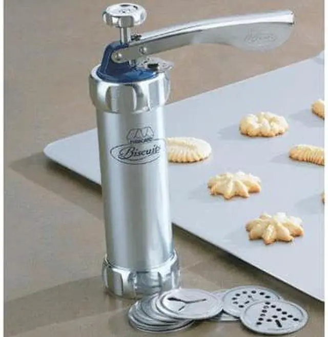 The Atlas deluxe biscuit/cookie maker comes with 20 discs. Do the math - the possibilities are extensive! This multi-purpose device is made from food grade aluminum and operated manually for simple use and maintenance. The biscuit/cookie maker is easy to clean, too, and a must-have for a serious baking tool collection. Instructions and a recipe booklet are included. Made in Italy.