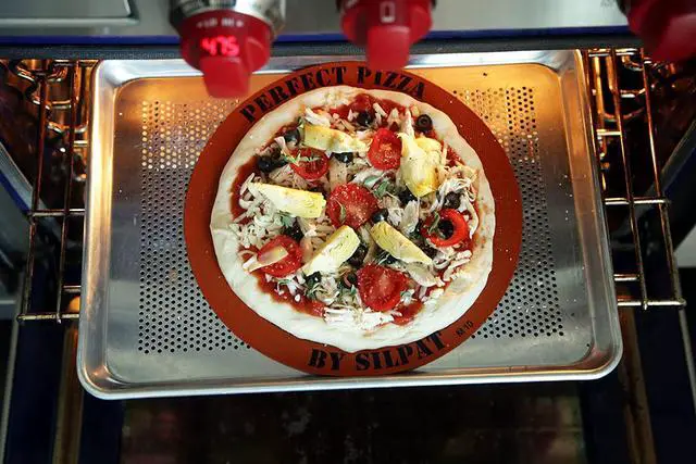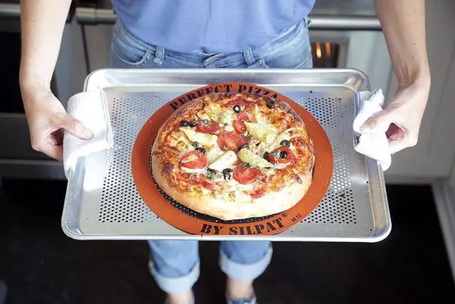 This 12 inch pizza mat will turn any sheet pan you have into a non-stick surface. No longer do you have to waste time and money on parchment paper, an expensive stone, spray, butter, grease, etc. The Silpat perfect Pizza mat is perforated to allow for maximum heat circulation and an excellent bake. Crispy, crunchy pizza is as easy as one, two, three with the Silpat Perfect Pizza! Silpat's proprietary silicone and fiberglass mesh is our own formulations made in our factory. This is not a cheap industrial silicone that is present in other silicone products. Silpat is especially great for working with sticky materials such as gooey dough, taffy, caramel, or anything your imagination allows. This mat specifically is designed for baking pizza without the use of spray, grease, oil, parchment paper or a pizza stone. Nothing sticks to Silpat, so it will save you a lot of time cleaning as there is no more sticky mess on your pans! Silpat never needs greasing, which saves both time and money. Use Silpat instead for any baking recipe that calls for parchment paper. Utilizing Silpat products saves time, money and creates less waste for our environment. It is ideal for use when creating Danish pastries, baking biscuits, working with sugar and all sugary and salted preparations. Silpat non-stick mats are made of fiberglass and silicone, and can be used thousands of times. Life of Product varies-lasts 2, 000 to 3, 000 uses depending on use and care. Silpat products conform to us regulations on food grade silicone, and are FDA, NSF, and Kosher certified. Can be used at temperatures varying from -40 degrees C to 250 degrees C (-40 degrees F to 482 degrees F). Do not cut the Silpat as the fiberglass mesh particles might migrate into the food. Designed in France. Made in China. Silpat is known around the world as the original non-stick baking liner. Silpat liners are made of fiberglass and food grade silicone and are completely food safe. Nothing sticks to Silpat!