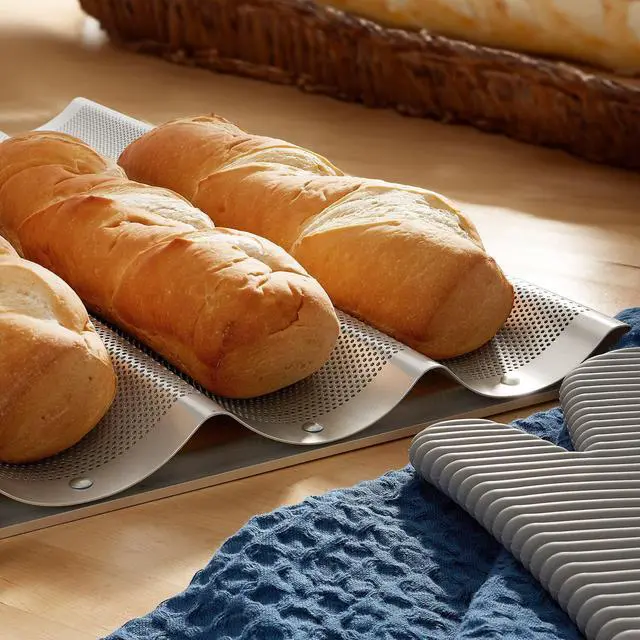 Gridmann's baguette pan features a glazed non-stick coating for easy release of the baked goods. The bread loaf pan is designed to maintain a uniform shape and size for each baked loaf without any tears or uneven crust. The pan's four evenly shaped mold compartments support the dough during baking, preventing it from spreading and helping create a classic French bread loaf. This consistency is essential for bakers to achieve a professional appearance and taste in every loaf. With this baguette pan, bakers can confidently produce baguettes that look and taste great every time.