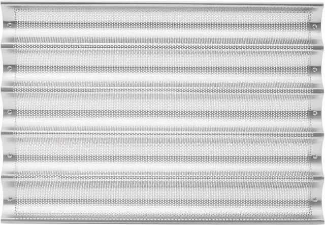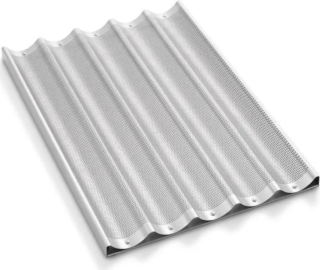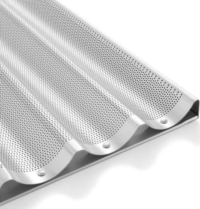Baguette pans are a staple in professional bakeries and commercial kitchens for crafting the perfect baguette. Gridmann's five loaf, long baguette pan features a perforated design that promotes even heat distribution and airflow around the dough, resulting in crispy crusts and light, airy interiors. Measuring 18" x 26", this pan is compatible with commercial ovens only, ensuring reliable performance.