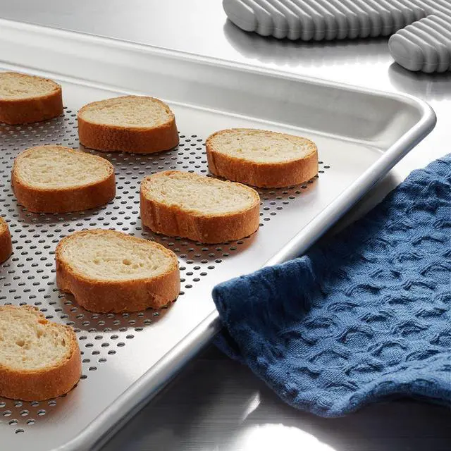 Perforated baking sheet pans are essential for bakers looking to achieve perfectly crisp and evenly baked results. The double-row perforation allows for exceptional air circulation, which ensures that your baked goods cook evenly throughout. This feature is especially beneficial when baking items like bread, pizza, and pastries that require a crisp, golden-brown finish. The perforations help prevent sogginess and promote the perfect texture in your baked goods by allowing moisture to escape.