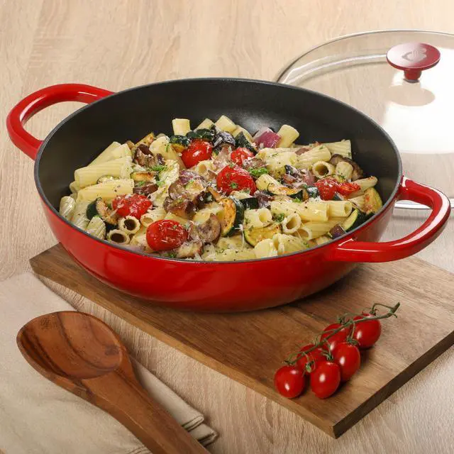 The Crock-Pot Artisan 5 Qt. Multi-Use Pan is a versatile kitchen essential designed for cooking, serving, and storing with ease. Crafted from durable cast iron and finished with a beautiful enamel coating, this braiser evenly distributes and retains heat-perfect for slow-simmered stews, baked dishes, or stovetop searing. Sturdy side handles provide a secure grip when transferring from oven to table. With a lower profile that enhances both cooking performance and storage convenience, this updated kitchen classic brings timeless function and fresh style to any kitchen.