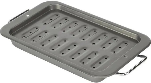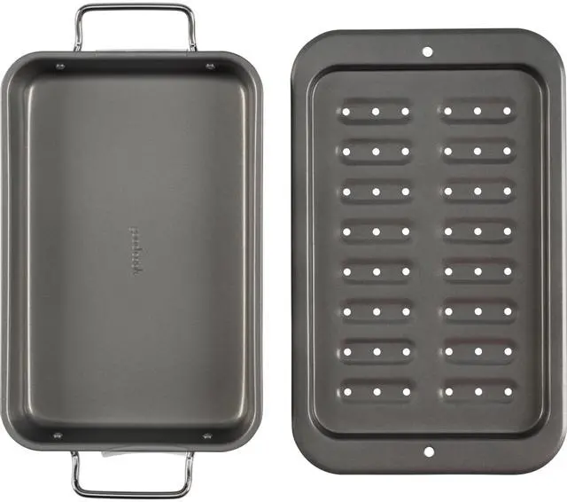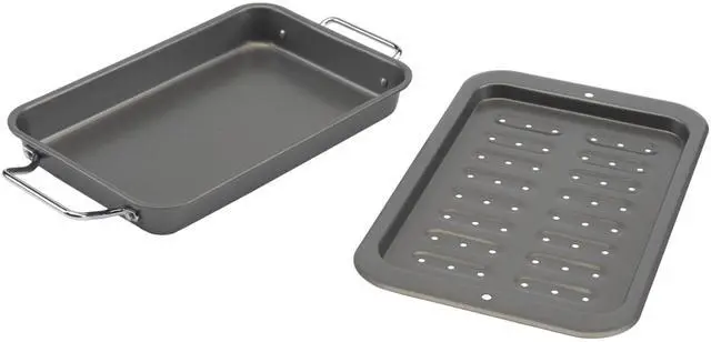 This compact version of our GoodCook Broiler Pan is perfect for roasting and broiler in your toaster oven. With a 2-piece construction that allows for excellent drainage of all the excess drippings from your pan cover to the pan below, you can enjoy healthy eating all the time. The 7" x 11" surface area is great for smaller portions or cooking for one. Clean up is easy with a durable nonstick surface that makes food remnants just slide off with hand washing, although the pan is dishwasher safe as well. Metal utensils will not scratch the coating so that's one less thing to worry about, and it is PFOA and PTFE free. Handles are built-in, giving you a safe way to transport in and out of the oven. Use the pan by itself for one-pan recipes or as an extra baking pan to have around your kitchen. This pan made from heavy weight steel that will not warp or bend, and should provide years of service when used properly.
