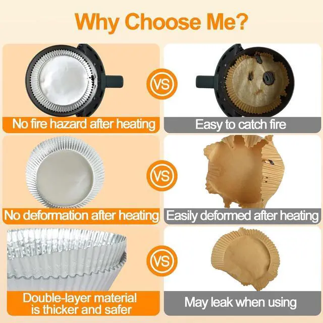 New Upgrade Materials:Our Air Fryer Liner is made of high quality aluminum foil. So our product is more heat resistant than the parchment air fryer liner. It can withstand high temperatures of up to 600°C. No fire hazard and not easy to deform.