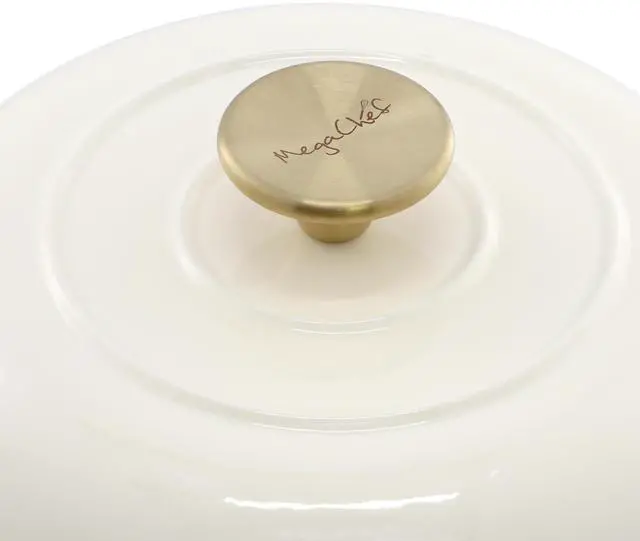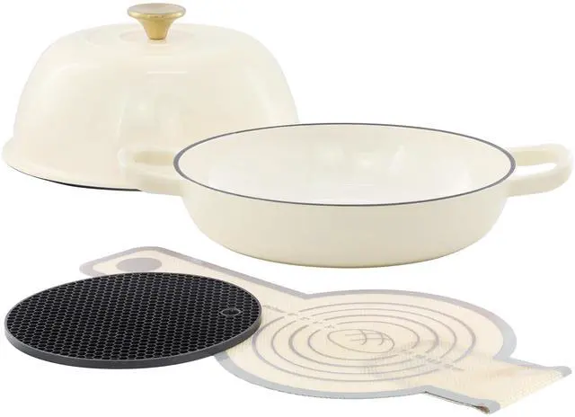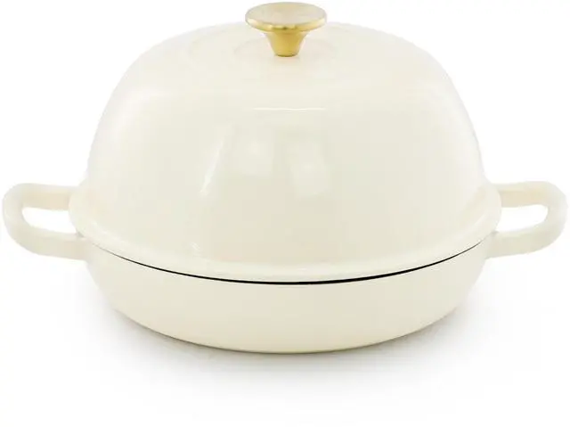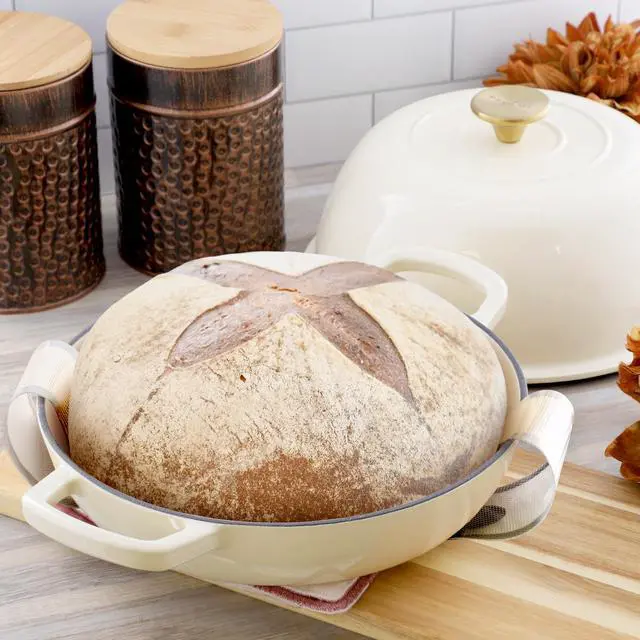 The MegaChef 6 Quart Enameled Cast Iron Bread Pot in Cream is the perfect companion for any home baker. Crafted from durable enameled cast iron, this round bread pot ensures even heat distribution, making it ideal for baking artisanal loaves with a crispy crust and soft, fluffy interior. The high-ceiling lid, complete with a stainless steel knob, helps retain moisture and creates a steaming environment for perfectly baked bread every time. With its calming cream enameled finish, this bread pot not only performs exceptionally but also adds a stylish touch to your kitchen. The silicone grip for the lid makes it easy to handle, while the oven-safe silicone baking mat with bread diameter measurements ensures consistent and professional results.