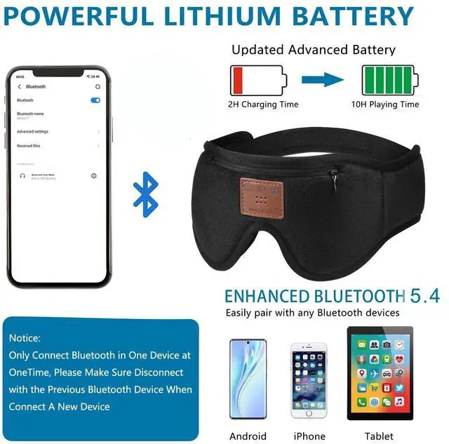 2-Pack Sleep Mask with Bluetooth HeadphonesZRUHIG Sleep mask with Bluetooth headphones has a built-in Bluetooth HD Stereo Speakers that can be paired with any smartphone or tablet device within a 33 feet range. The high-quality 5.4 Bluetooth surprisingly clear sound, bringing you a distinctive listening experience