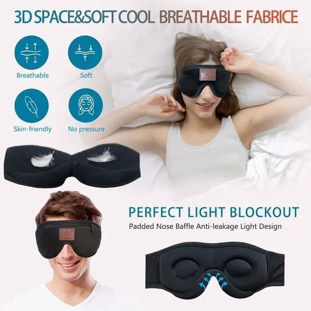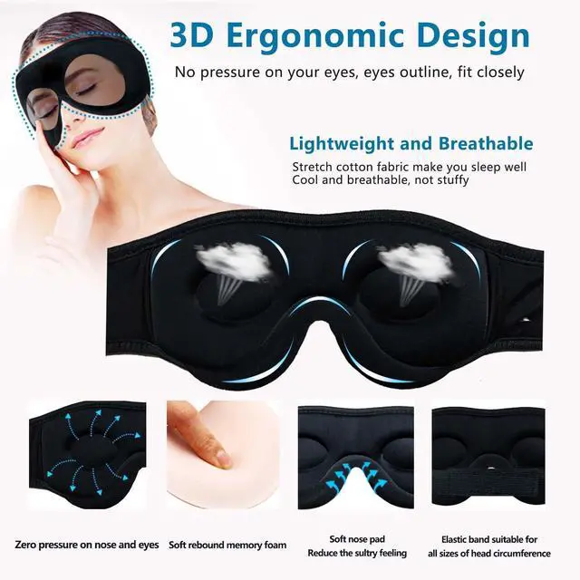 Comfortable & 3D Contoured Cup DesignThe sleep mask is made from premium memory foam and comfortable fabrics, plus the ergonomic 3D design allows your eyes to move freely without pressure, and the ultra-light weight will make it almost impossible to feel it on your face as you drift off to sleep quickly to music