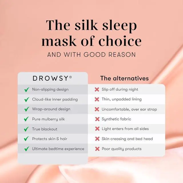 THE WORLDS MOST LUXURIOUS SLEEP MASK Loved by beauty editors and celebrities around the world. Multi award-winning. Drowsy is the beauty industrys silk sleep mask of choice. Wrap your eyes in padded silk for an uninterrupted, glorious sleeping experience every night.