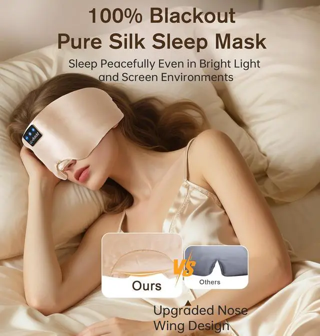 Ergonomic Design: Experience the ultimate in light-blocking technology with our ergonomic silk sleep mask, scientifically designed using comprehensive facial data to contour perfectly to every face shape. The innovative triangle wing design and extended coverage create a complete blackout environment. Enjoy uninterrupted rest as our larger-sized bluetooth sleep mask comfortably conforms to your facial contours without pressure, bring the most serene sleeping experience imaginable