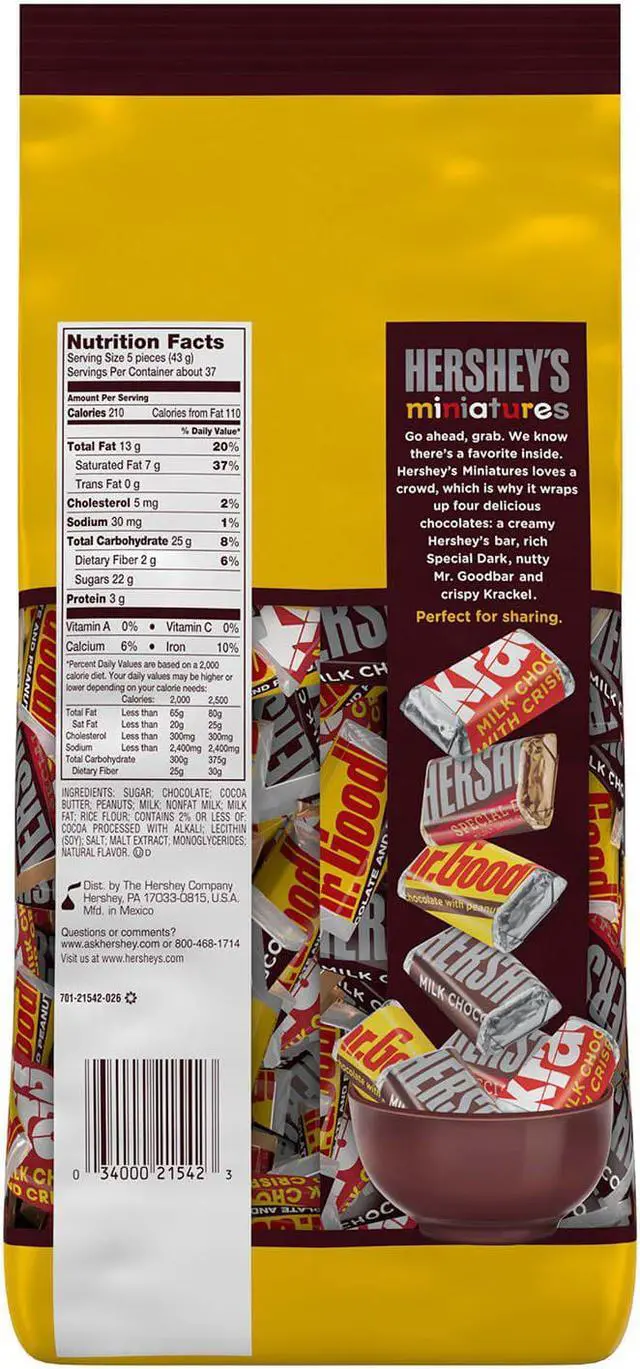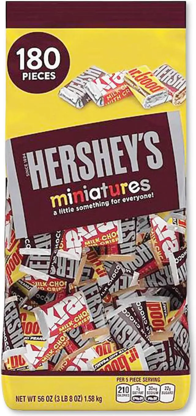 Treat guests with a candy dish full of delicious Hersheys miniatures assortment. Individually wrapped chocolate sweets to satisfy whatever craving strikes. Perfect addition to any dessert table. Food Type: Candy Bars; Flavor: Krackle; Milk Chocolate; Mr. Goodbar; Special Dark; Capacity (Weight): 56 oz; Sugar Free: No.