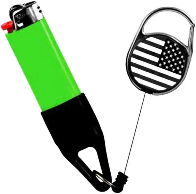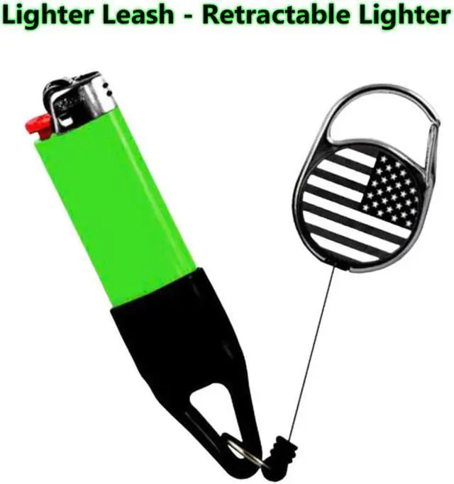 Lighter Leash - Retractable lighter holder in a sleek and bold black American Flag design the perfect blend of style and functionality for your everyday carry. This standard-sized lighter holder ensures your lighter is always within arm's reach and securely attached to your belt pocket or purse. The black backdrop provides a modern and sophisticated canvas for the iconic American Flag making a statement without compromising versatility. Crafted with durability in mind the retractable cord guarantees longevity making it a reliable companion for daily use. Compatible with standard-sized lighters this leash accommodates various popular brands catering to smokers and outdoor enthusiasts.