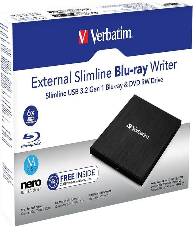 Verbatims External Slimline Blu-Ray Writer is an ideal solution for your notebook, ultrabook, or laptop that no longer includes a Blu-ray writer. With this easily portable writer, you can back up and view all of the important files you dont want to lose family pictures, movies, accounting documents, etc. This writer, with an aluminum enclosure, is powered by a USB port allowing you to easily backup your data using standard optical discs (CDs, DVDs, Blu-ray discs), as well as highcapacity, BDXL discs offering more storage.