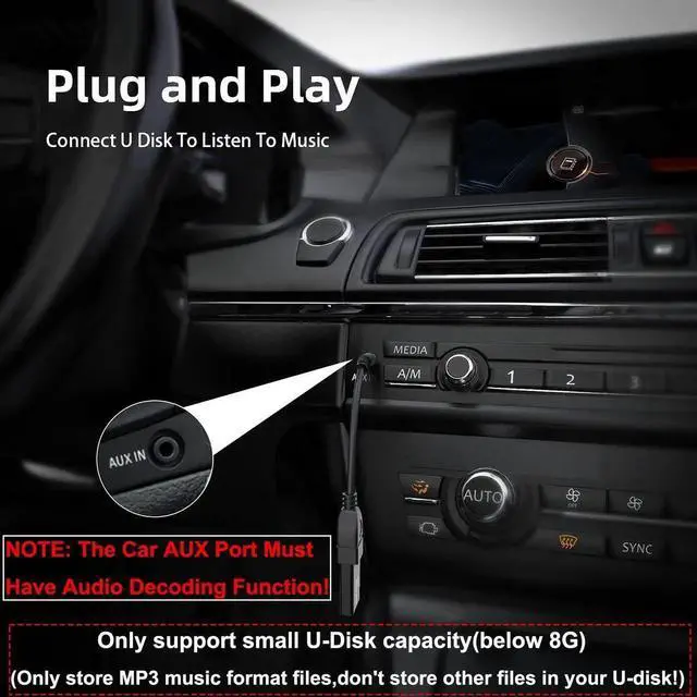 Plug and Play: Insert the 3.5mm male plug into Car GPS, CD, DVD speaker's AUX jack,then insert your U-DISK (or other USB port storage device) into the USB female port to play music.