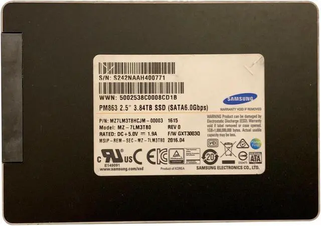 • MZ-7LM3T80 - Samsung PM863 Series 3.8TB SATA 6Gb/s Read-Intensive (AES-256 / PLP) 2.5-inch TLC Solid State Drive