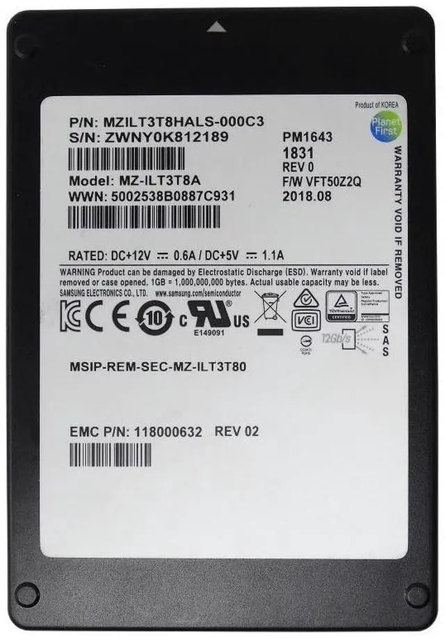 • Samsung PM1643 MZILT3T8HALS-000C3 Read Intensive SSD 3.84 TB SAS 12Gb/s EMC OEM Refurbished