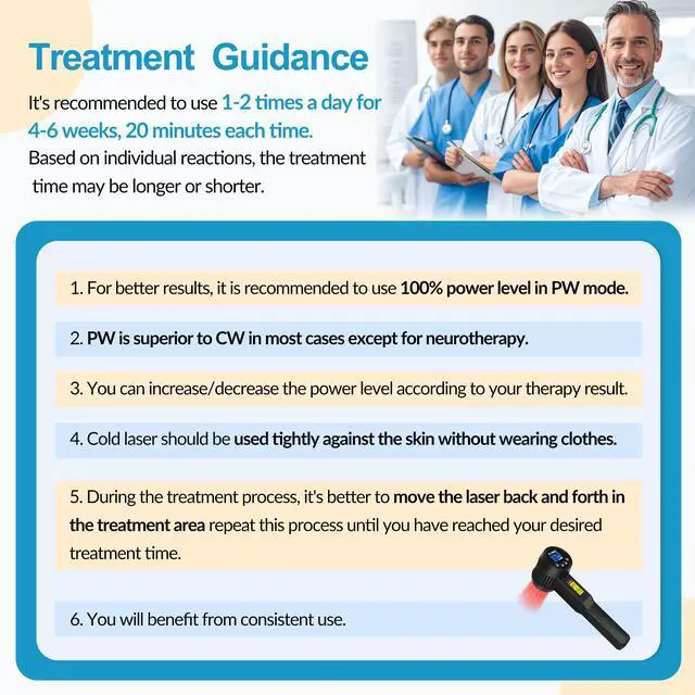 Multi-functions of the Infra Red Light Therapy DevicePower: 0.75W/1.5W/2.25W/3W four levels adjustable(Class 4); Time: 1 to 60 minutes adjustable; Mode: CW-continuous wave and PW-pulsed wave at 10Hz adjustable ( There is evidence proven that PW is superior to CW for most application except nerve regeneration ). (Note: Long press On/Off of low laser therapy to turn on/off device, quick click On/Off of low level cold laser to work). cold laser for pain recommended to use 3-4 times a week for 6 weeks, 10-15 minutes each time((according to your physical condition)