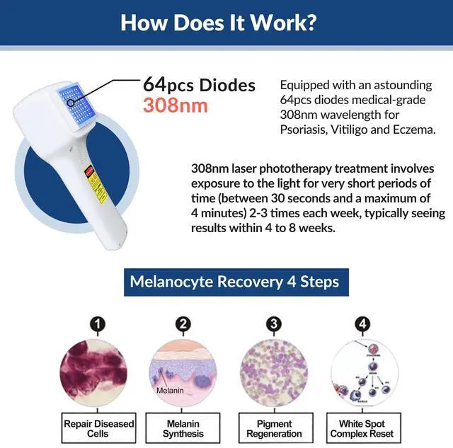 [308nm Wavelength & 49 Diodes] Clinically proven 308nm excimer light is the best wavelength to treat vitiligo psoriasis. Equipped with 49 medical diodes, greatly strengthens effects of treating various skin diseases. Excimer phototherapy device penetrates multiple skin tissues, reaches the base layer of skin, accurately acts on the core area of the lesion, Induce T cell death, enhance immunity and eliminate lesions. Promote melanin proliferation, even skin tone, promote wound healing