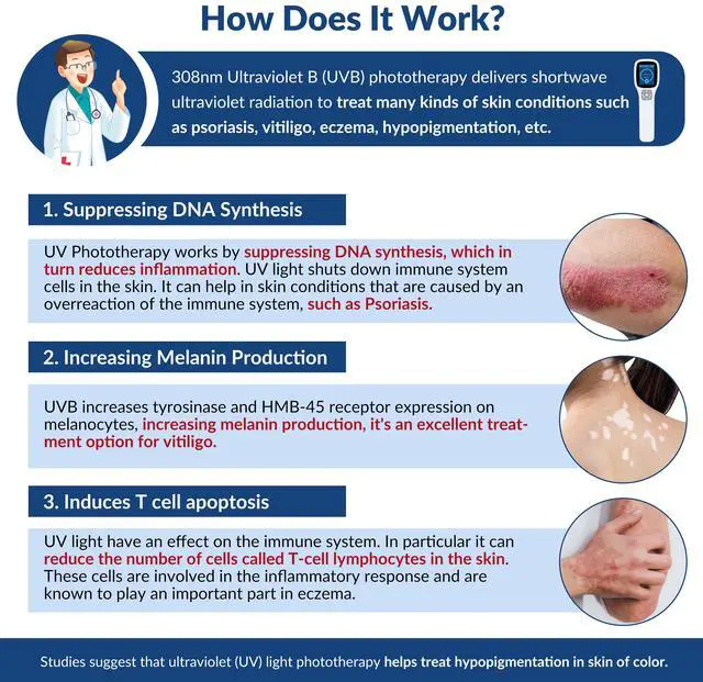 Depends on the condition: The length of treatment varies. For some conditions like psoriasis or vitiligo, it may take several weeks or even months of consistent treatment to see significant improvement.