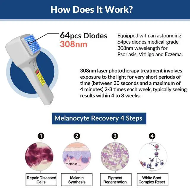 [308nm Wavelength & 49 Diodes]Clinically proven 308nm excimer light is the best wavelength to treat vitiligo psoriasis. Equipped with 49 medical diodes, greatly strengthens effects of treating various skin diseases. Excimer phototherapy device penetrates multiple skin tissues, reaches the base layer of skin, accurately acts on the core area of the lesion, Induce T cell death, enhance immunity and eliminate lesions. Promote melanin proliferation, even skin tone, promote wound healing