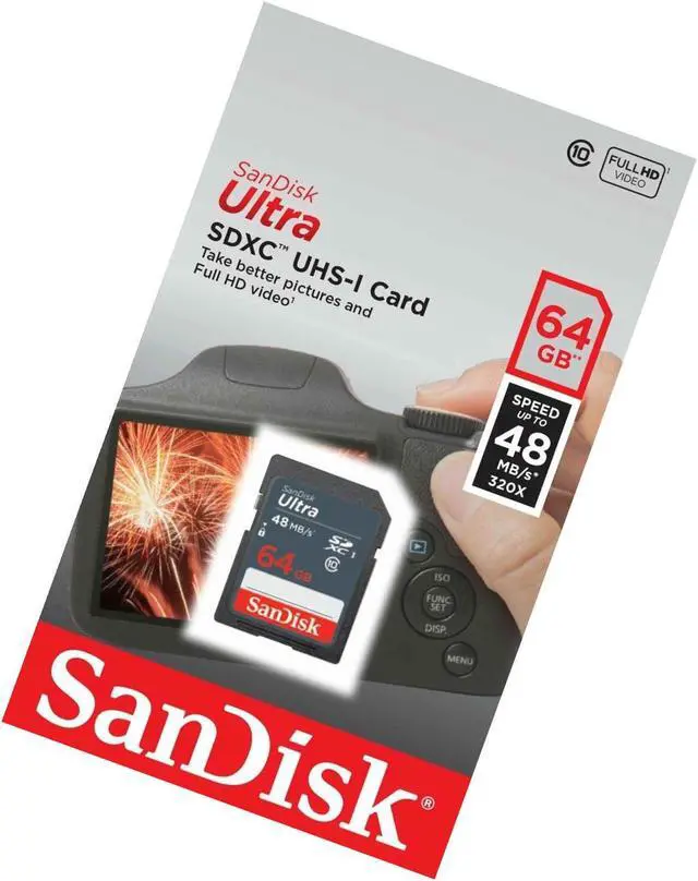 Brand: San Disk Model: SDSDUNB-064G-GN3IN TYPE: SDXC CAPACITY: 64GB SPEED RATING: 320X rating TRANSFER RATES: Read speed up to 48MB/sec Write speed up to 15MB/sec DIMENSIONS: 32mm x 24mm x 2.1 mm PACKAGING: Retail packaging
