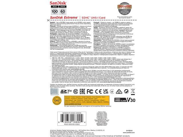 SanDisk 32GB 32G extreme SDHC 100 MB/s 60 MB/s SDSDXVT-032G-GNCIN Class 10 UHS V30