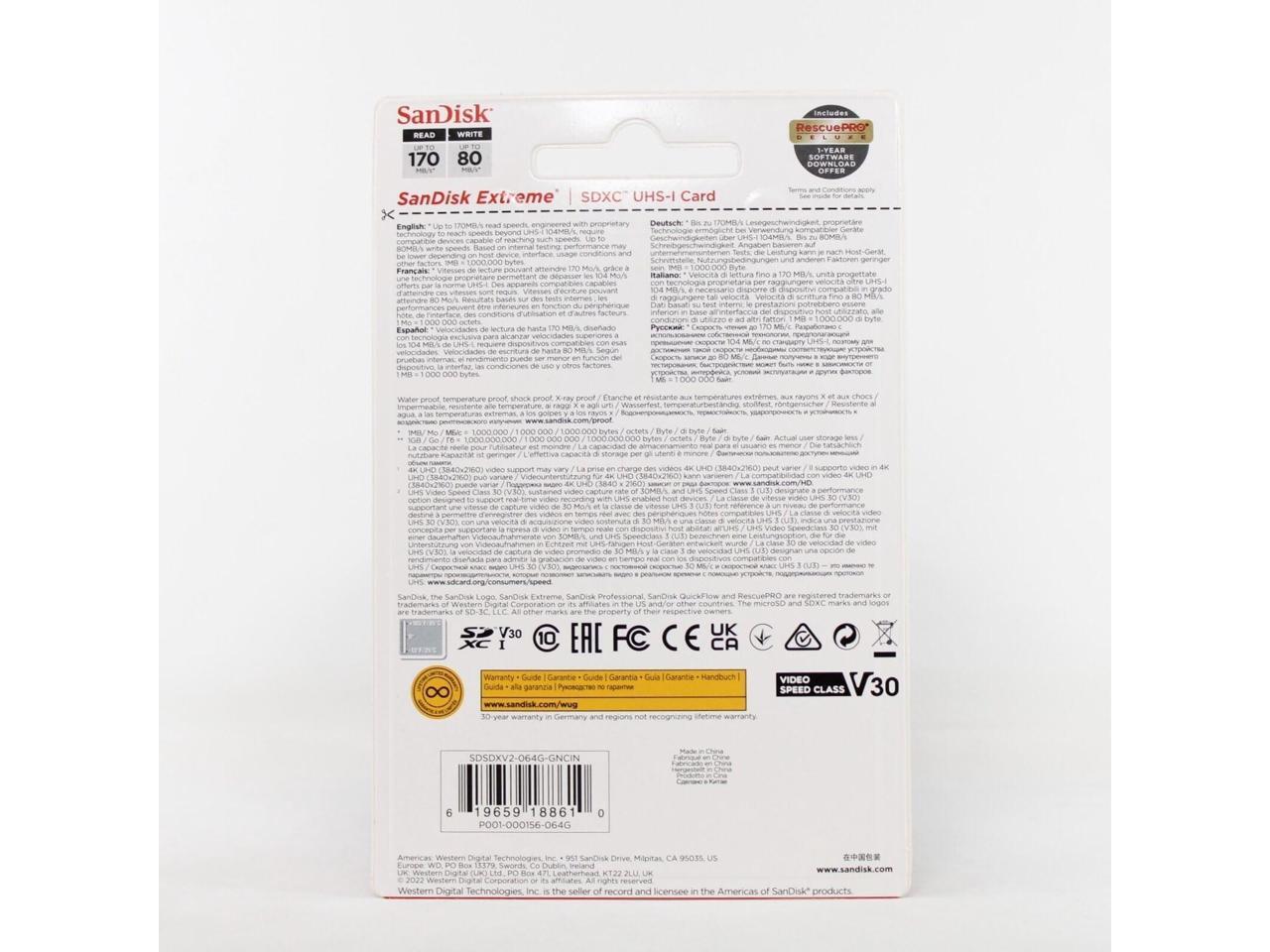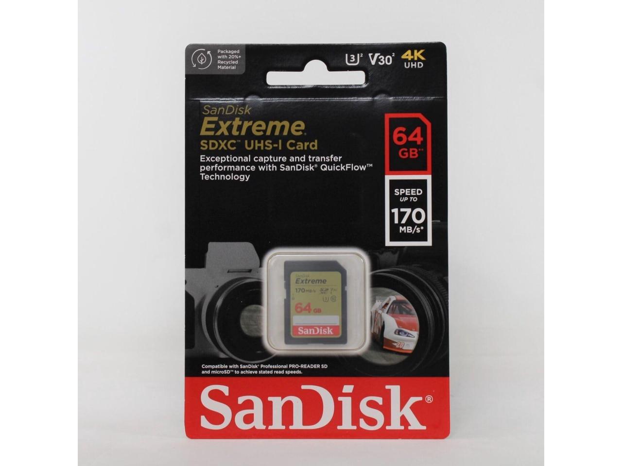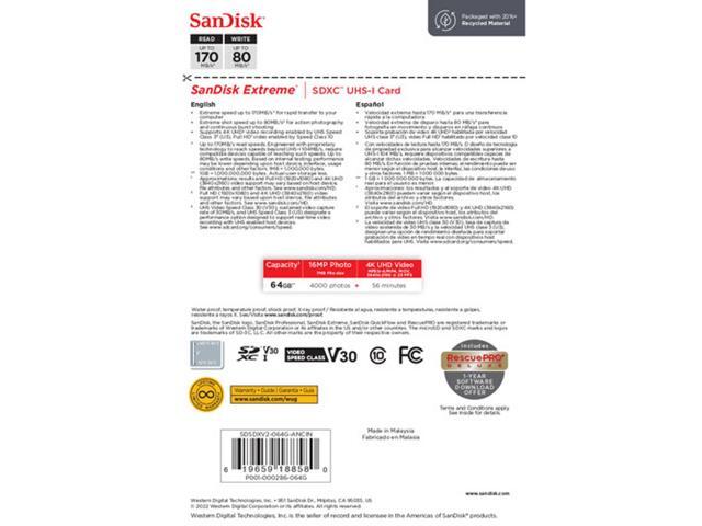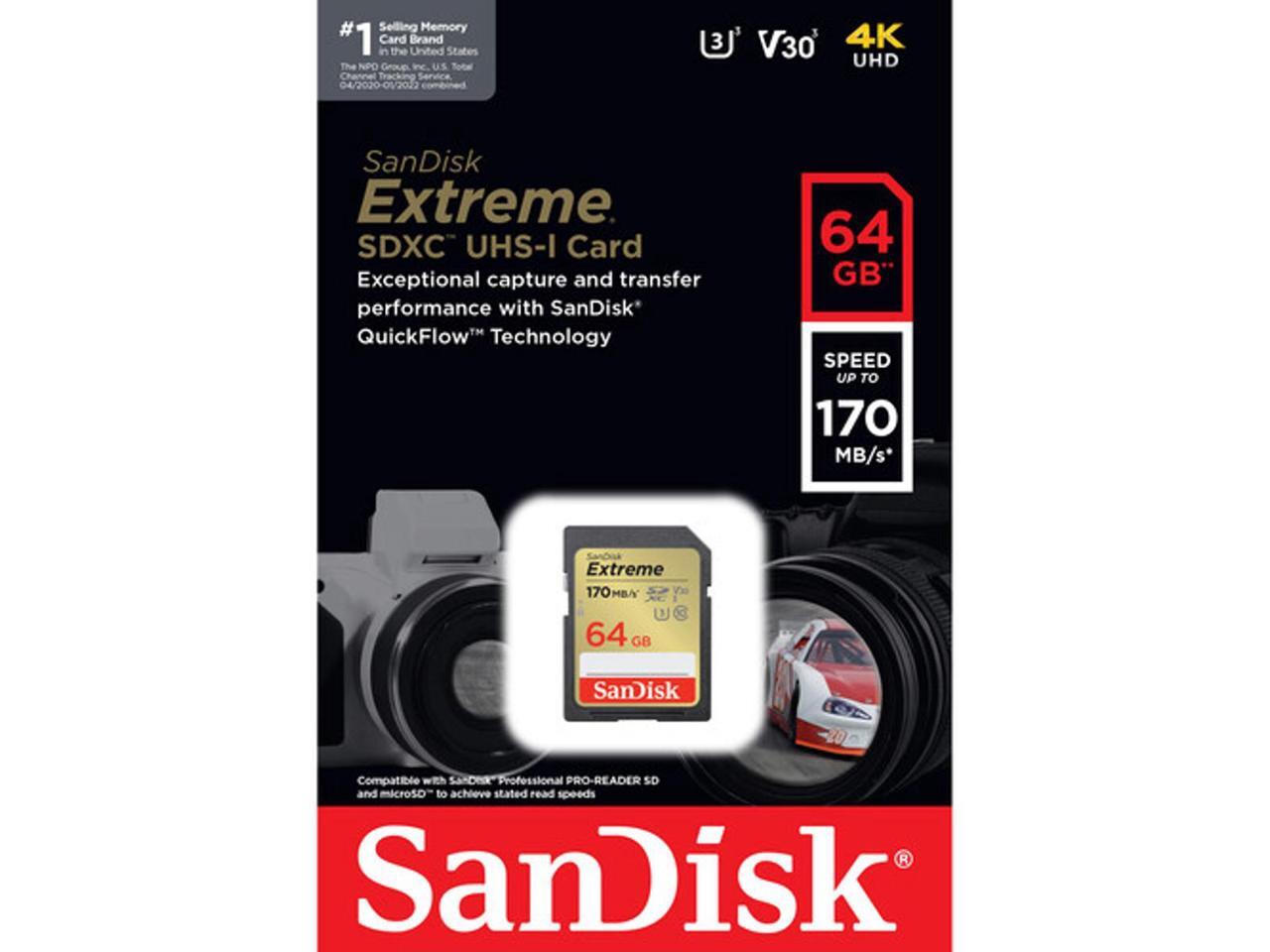 SanDisk Extreme 64 GB Class 10/UHS-I (U3) V30 SDXC - 170 MB/s Read - 80 MB/s Write - SDSDXV2-064G-ANCIN