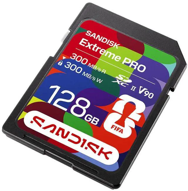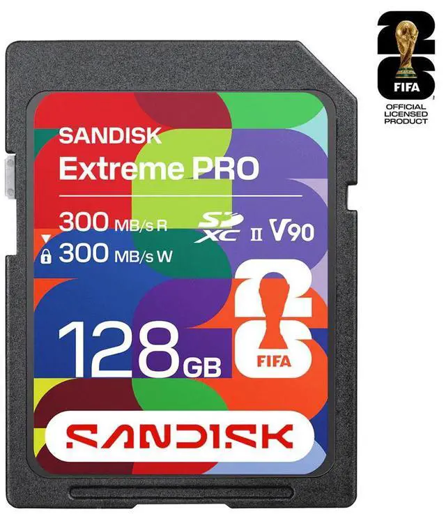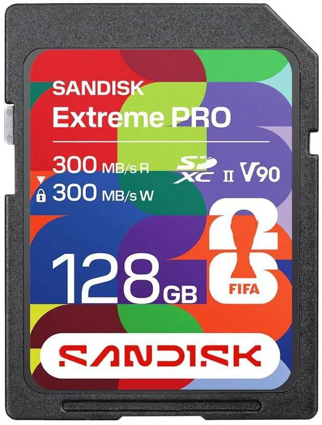 Each product includes a collectible FIFA World Cup 2026 sticker. Capture pulse-pounding playsWith write speeds up to 300MB/s, this card helps your camera keep up with continuous bursts, so you don't miss a game-changing goal. When you're capturing the action from the sidelines, you need a card that can keep up with 30 FPS burst mode to capture once-in-a-lifetime moments. Faster transfers. Smoother Edits. Easier sharing. With transfer speeds up to 300MB/s, you can keep your workflow in motion. From offloading on the fly to racing to meet a deadline, this card enables you to go from capture to delivery without missing a beat. Space for history-making momentsThe 128GB capacity delivers the room you need for continuous shooting bursts, 4K video sequences, and backup storage during those crucial tournament moments. From penalty shootouts that decide championships to celebration shots that define careers, this card enables you to capture frames that make front pages worldwide. Built for Match DayFrom fan zones to the sidelines, this card is engineered to perform when conditions get unpredictable. With IP68 water and dust resistance, up to 40N of bend resistance, drop protection up to 6 meters, and up to 20, 000 insertion cycles, it's built to handle the chaos of game day.