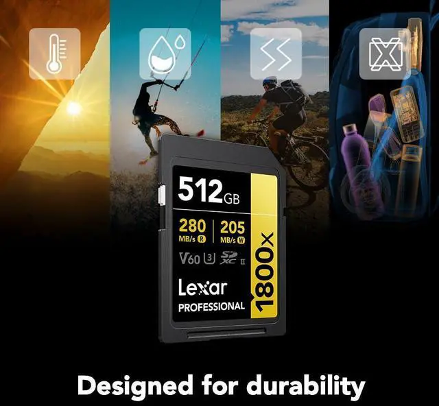 The Lexar Professional 1800x SDXC UHS-II Card GOLD Series is not only fast but also boasts write speeds up to 205MB/s, making it the ideal companion for burst photography. With its V60 and UHS Speed Class 10 (U3) ratings, this memory card ensures smooth, uninterrupted Full-HD and 4K video recording, while the generous 512GB capacity accommodates extensive multimedia files without a hitch. Designed for durability, this memory card withstands the toughest conditions, being waterproof, temperature-proof, shockproof, vibration-proof, and X-ray-proof. Whether you're shooting in the rain, enduring extreme temperatures, or traveling through security checkpoints, your data remains safe and intact.