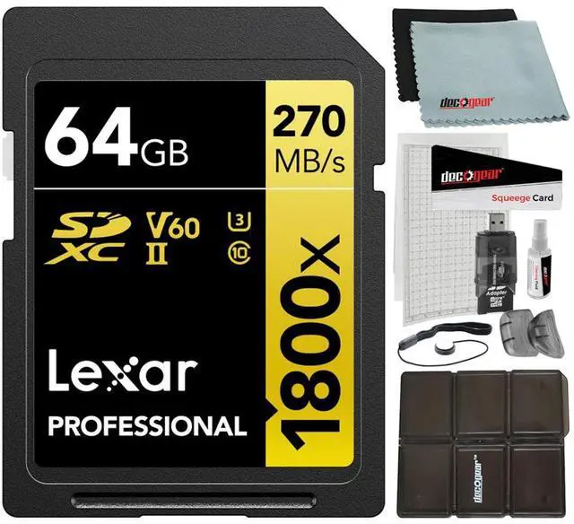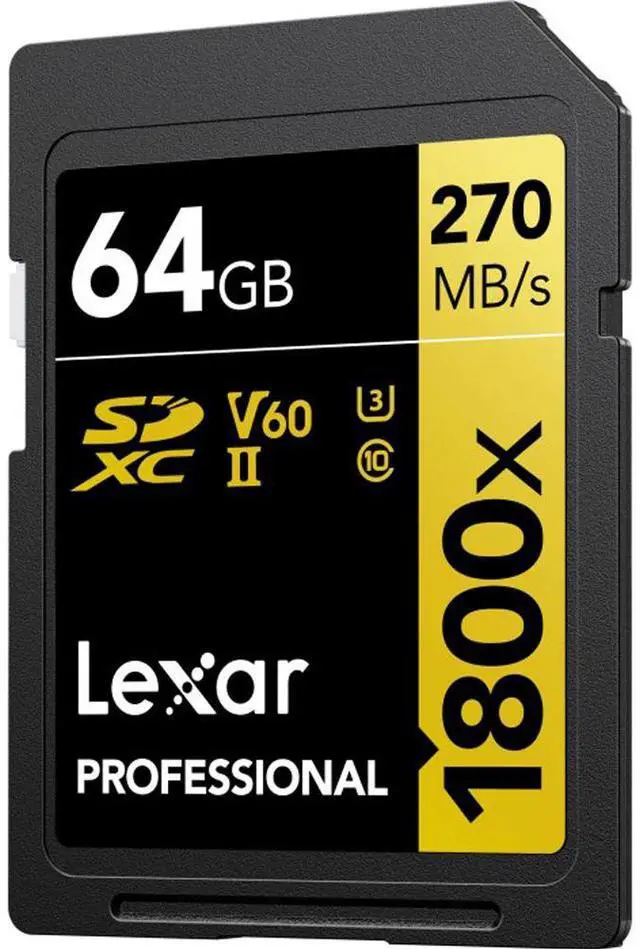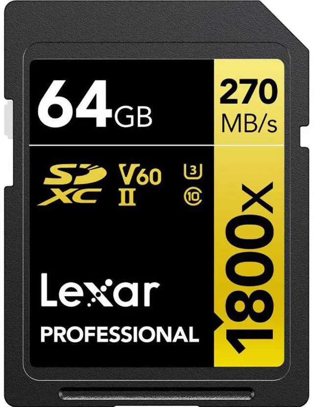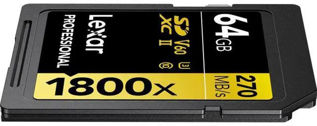Product Features: Speed Up Your WorkflowLexar Professional 1800x SDXC UHS-II Card GOLD Series offers super-fast read speeds up to 270MB/s to accelerate your post-production workflow - saving you time and getting you back to the business of photography. V60 rated for Smooth Full-HD and 4K Video CaptureWith the latest UHS-II technology and write speeds up to 180MB/s, the Lexar® Professional 1800x SDXC™ UHS-II Card GOLD Series allows you to handle photos in burst mode with ease. And, with V60 and UHS Speed Class 3 (U3), seamlessly capture stunning Full-HD and 4K video with large capacity options up to 256GB. Designed for DurabilityThese cards provide the performance you need to capture and store valuable data in a variety of elements. Lexar® Professional 1800x SDXC™ UHS-II Card is water-proof, temperature-proof, shockproof, vibration-proof, and X-ray-proof. UHS-I Backwards CompatibleFor versatility, the cards are also backwards compatible with UHS-I devices, performing up to the maximum thresholds of UHS-I speed capabilities. Rigorously TestedAll Lexar product designs undergo extensive testing in the Lexar Quality Labs, facilities with more than 1, 100 digital devices, to ensure performance, quality, compatibility, and reliability.
