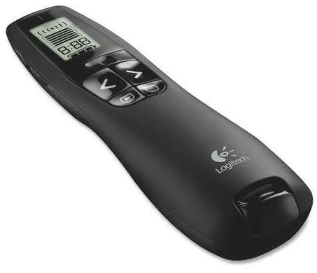 The Logitech R800 Presentation Remote Control gives a powerful control for high-impact presentations. A green laser pointer is easy to see, even on flat panel displays, projection screens, and in brightly lit rooms. The LCD screen with a timer allows to manage time with silent vibrating alerts and has controls that are easy to set and adjust. This presenter comes with a storable plug-and-play wireless receiver, intuitive controls, two AAA batteries and a carrying case.