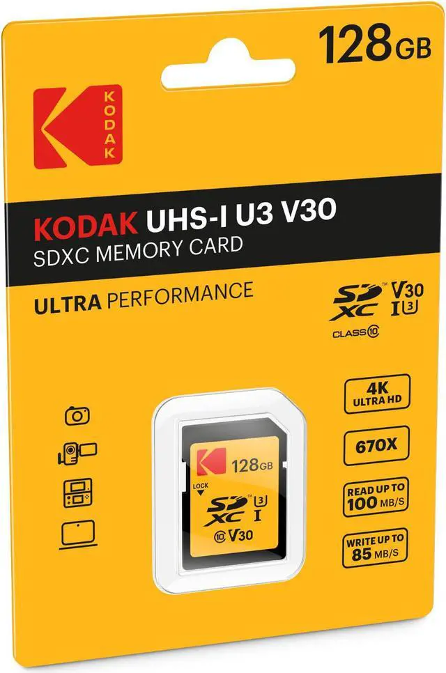 For 4K Ultra HD video recording and high speed continuous shooting the Kodak UHS-I U3 V30 SDXC Memory Card offers a 128GB storage capacity for all your needs. UHS Speed Class 3 (U3), Video Speed Class 30 (V30) Optimized for 4K FULL HD (3840x2160p) video recording and playback. Up to 85MB/s Write Speed Ideal for the use in DSL Reflex cameras for high speed continuous and/or raw shootings and 4K recording. Up to 95MB/s Read Speed For super-fast transfer of high resolution pictures and 4K videos from the card onto your computer or any SD compatible devices. 128GB Storage Capacity Because 4K videos and raw shooting pictures not only require significant higher write and read performances, but also higher space on the card.