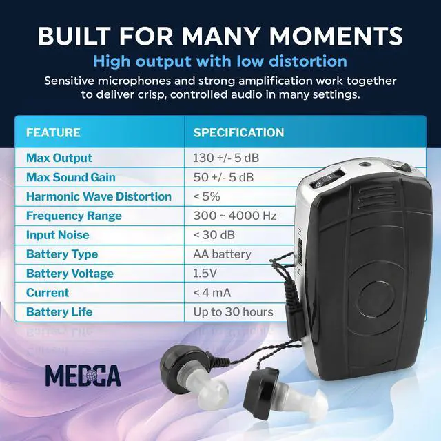 Ever wish you could let hearing problems be a problem of the past?KEY_TAB Now you can with theKEY_TAB MEDca Pocket Sound Personal Sound Amplifier!KEY_TAB This sound amplifier is perfect for birdwatchers, senior citizens, sports fans, tv watching, hunting, sleuths, hospitals, courtrooms, theaters, churches and more. Our pocket sound amplifier comes with a belt clip which means that you can attach this miracle hearing and use it on the go!