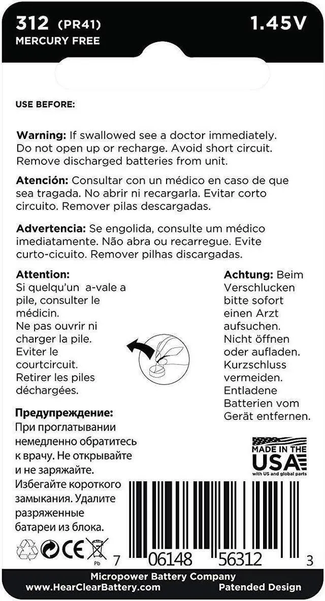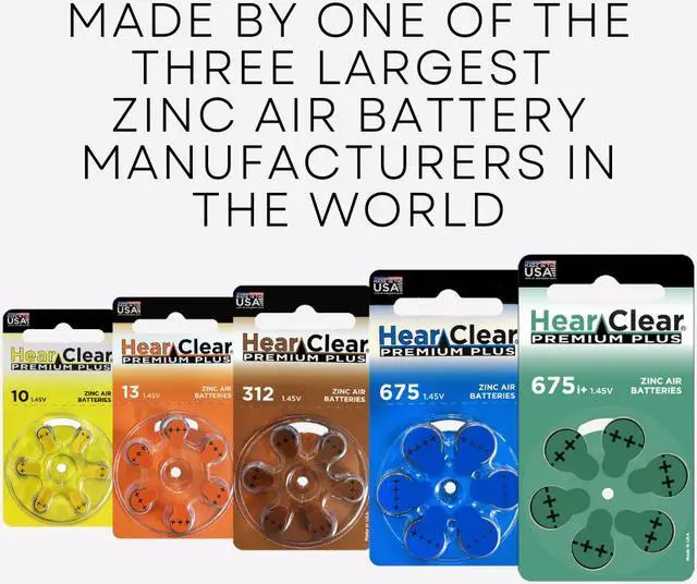 HearClear hearing aid batteries are backed by over 23 years of research and development, utilizing a unique patented technology in their design. HearClear batteries are 1.45V, suitable for hearing aids using zinc air batteries, and are available in sizes 10, 13, 312, 675, and the 675P cochlear battery for cochlear implant devices. These batteries are made in the USA with US and global parts.