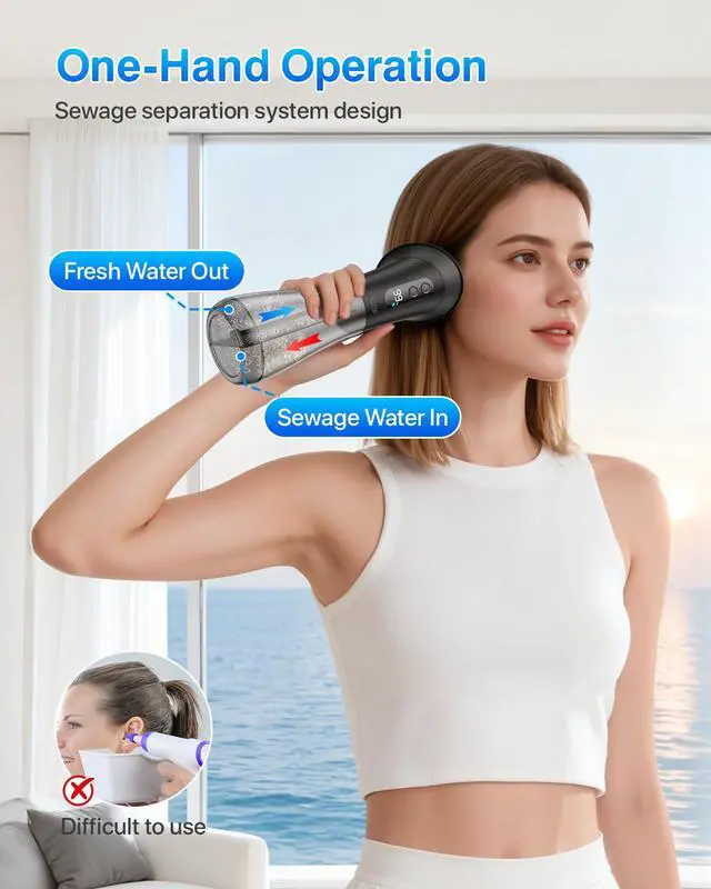 Say goodbye to unhygienic and awkward traditional irrigators. Our patented 2-in-1 tank keeps fresh water and wastewater completely separate. The simple, detachable design allows for easy filling, cleaning, and one-handed operation. No more spills or mess!